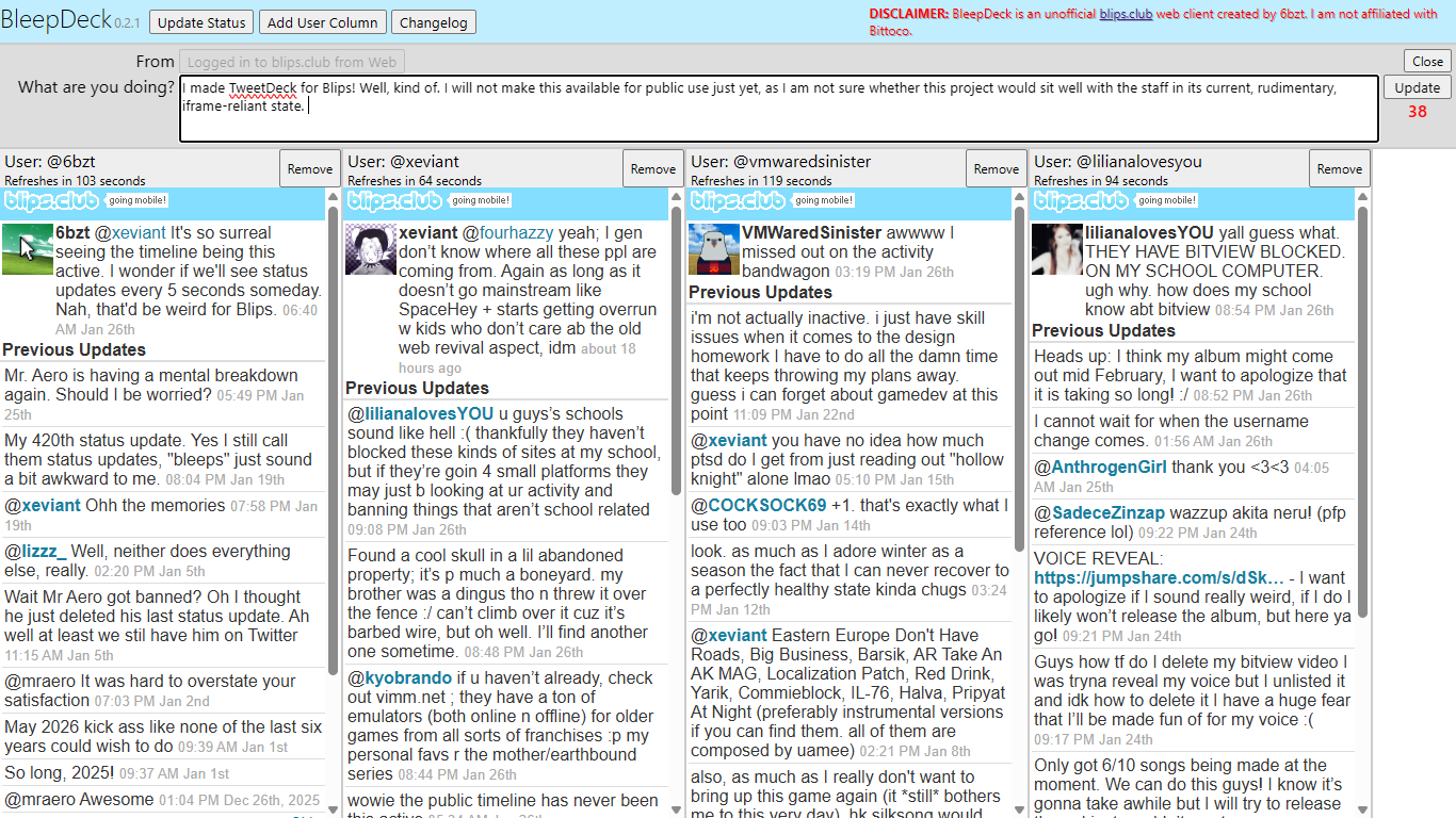 I made TweetDeck for Blips! Well, kind of. I will not make this available for public use just yet, as I am not sure whether this project would sit well with the staff in its current, rudimentary, iframe-reliant state. https://6bzt.neocities.org/…